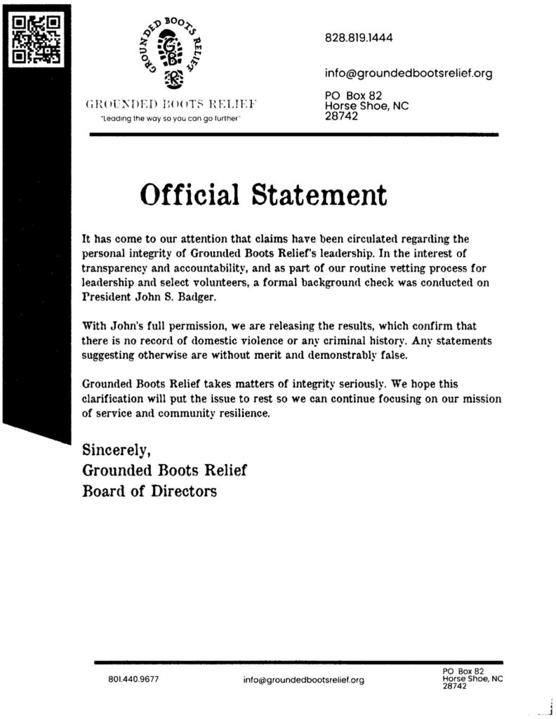 It has come to our attention that claims have been circulated regarding the personal integrity of Grounded Boots Relief’s leadership. In the interest of transparency and accountability, and as part of our routine vetting process for leadership and select volunteers, a formal background check was conducted on President John S. Badger.